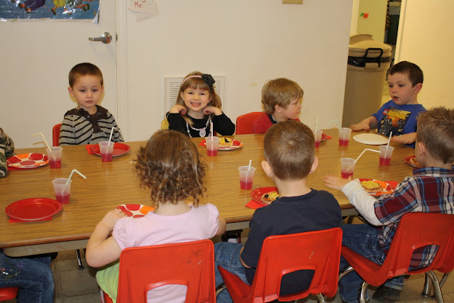 She brought funny face pizzas and a trick juice that was actually jello. The kids thought it was pretty funny.
